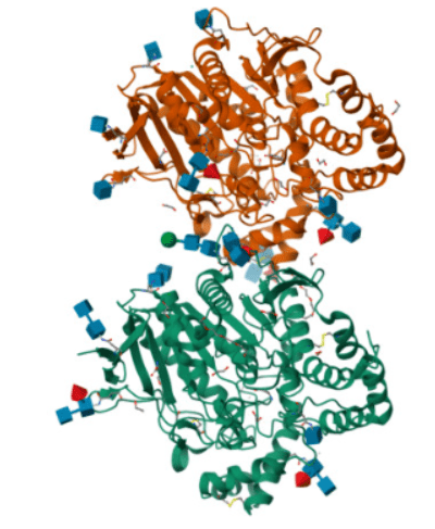 Butyrylcholinesterase (EC 3.1.1.8; BChE), also known as cholinesterase, pseudocholinesterase, or plasma cholinesterase, is a sister enzyme of acetylcholinesterase28\(V. Whittaker, 2010). BChE is essential for catalyzing the hydrolysis of butyrylcholine, breaking it down into choline and butyrate29. BChE is a tetrameric, 342 kDa glycoprotein synthesized in the liver, released into the bloodstream, and found in the brain, heart, muscles, lungs, small intestine, and adipose tissue1. BChE and acetylcholinesterase share a similar three-dimensional structure and are believed to have evolved from an ancestral AChE gene duplication29. Due to this, the structure of AChE and BChE are similar (Figure 6).