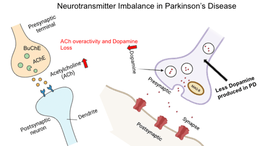 This diagram shows how dopamine loss and acetylcholine overactivity contribute to motor symptoms in Parkinson’s disease. Reduced dopamine release and MAO-B activity are shown on the right, while increased acetylcholine signaling with AChE and BuChE activity is shown on the left. The imbalance between these two systems underlies key features of the disease and informs targeted treatments.