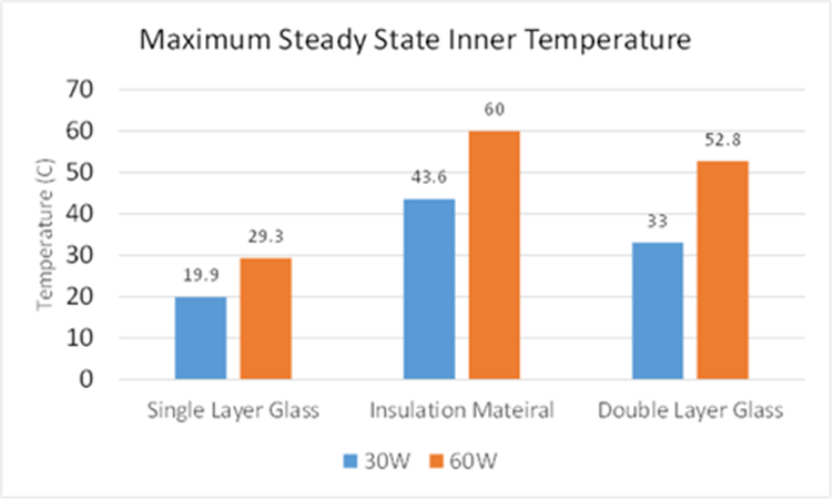 When the system achieves the steady state, the average of the inner temperatures, which include the TC1, TC2, TC3 and TC4, were shown in the Figures. With the single layer glass and the 30W heater, the steady state inner temperature is 19.9°C. The corresponding temperature increased to 33.0°C with double layer glass and 43.6°C with the insulation materials. The trends are similar with the 60W heater. It should be noted that when the inner temperature achieve 60°C, with the insulation materials, as shown in fig. 4e, the heater power is cut off considering the safety of the experiment. Fig. 5 presented the maximum steady state inner temperature for all cases. Results show, as expected, the 60W heater achieved higher steady state inner temperature than the 30W heater. For material wise, the single layer glass maintain the lowest temperature of 19.9°C while the insulation material can achieve 60°C inner temperatures.