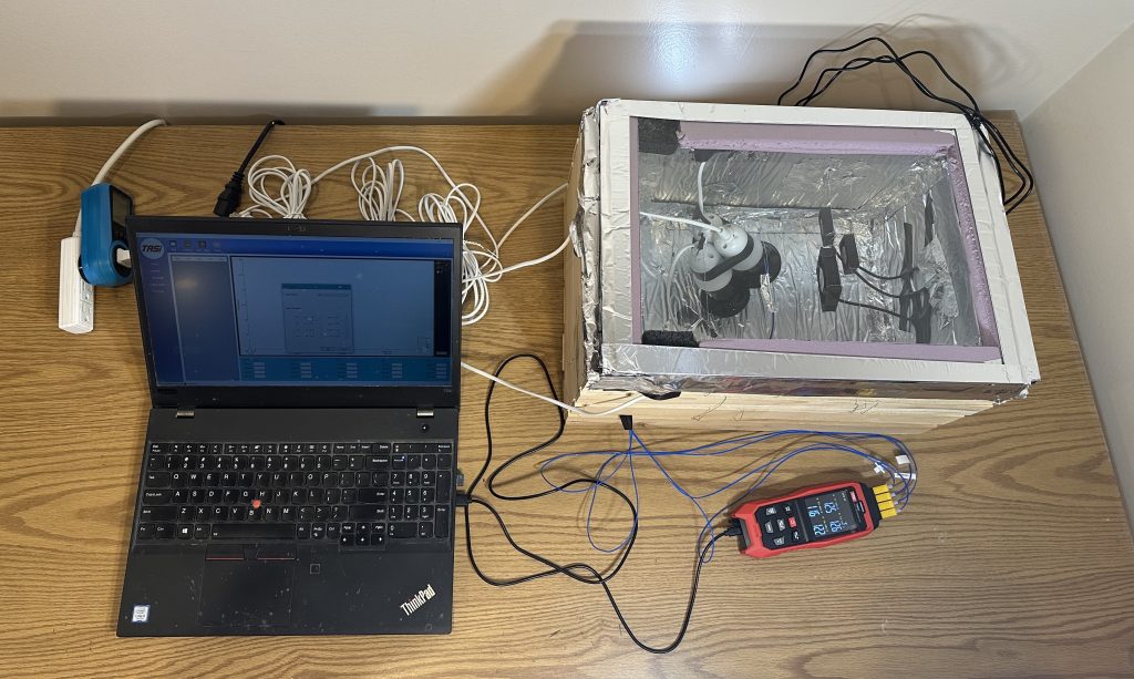 Inside the house model, an adjustable-power heater (30W/60W) is used to manually control the internal temperature. Four K-type thermocouples (TC1, TC2, TC3 and TC4) are placed on the inside surface centers of four walls of the internal space to capture the overall temperature distribution in the house model. The TCs are around 2-4mm distance away from the wall and they measure the air temperatures. To ensure the adequate mixing, a small fan is used inside the box to circulate the air. The thermocouples are connected to a computer data acquisition system to record temperature data in real-time. The software used to record temperatures are TA612C digital thermocouple measuring tool.