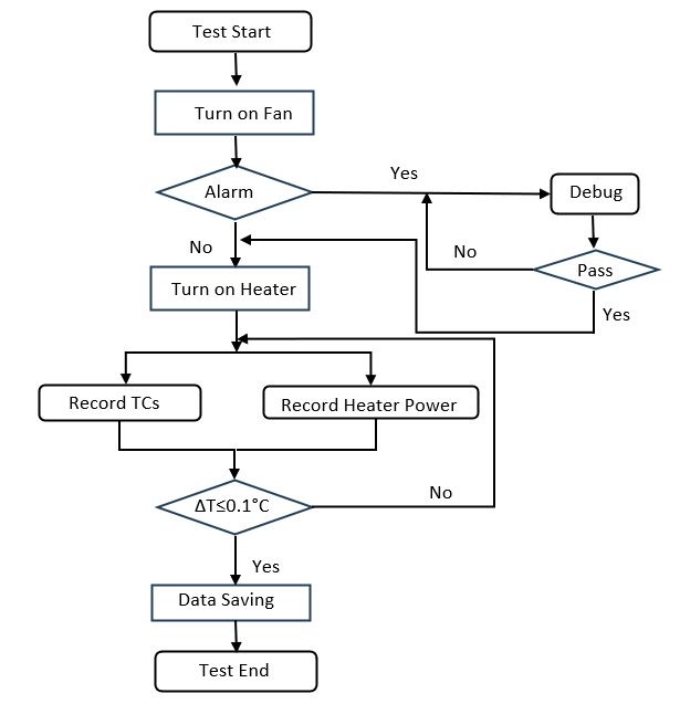 The system operating flowchart is designed as shown in fig.3. The experimental procedure starts with turning on the circulating fan. After confirming that the system operates without errors, the heater is turned on and the temperatures from the four thermocouples as well as the heater power are recorded simultaneously. The system is considered to have reached steady state when the average temperature measured by the four thermocouples varies by less than 0.1 °C. At this point, the test is regarded as complete.