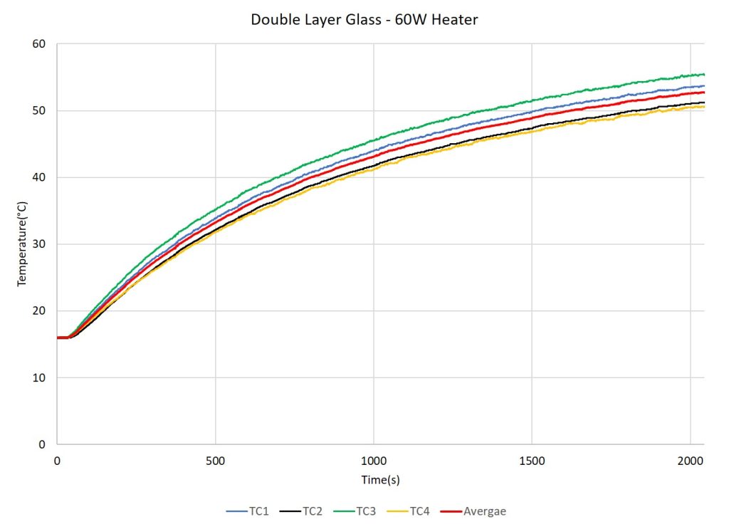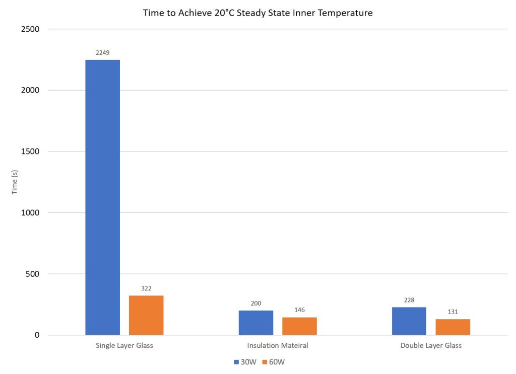 In this study, the steady state temperature and the time required to reach steady state were selected as the primary evaluation indices. The results show that, under the same 30 W heater power, the single layer glass configuration reached a steady state temperature of 19.9 °C, the double layer glass reached 33 °C, and the configuration with thermal insulation achieved 43.6 °C. The corresponding times to reach steady state were 2249 s, 1921 s, and 2546 s, respectively. Although the insulated configuration required a longer time (2546 s) to reach steady state than the other two materials, when both indicators are considered together, the thermal insulation exhibited the best overall performance. This also highlights that both metrics should be jointly assessed, with the steady state temperature being of greater importance. Furthermore, the heater power consumption was also measured. Under the same 30 W heater power, the energy required to reach steady state was 0.016, 0.015, and 0.020 kWh for the single layer glass, double layer glass, and insulation material configurations, respectively. Although the insulated configuration consumed the highest energy (0.020 kWh), it maintained a higher steady state temperature of 43.6 °C compared to the other two configurations, which reasonably explains the higher energy requirement