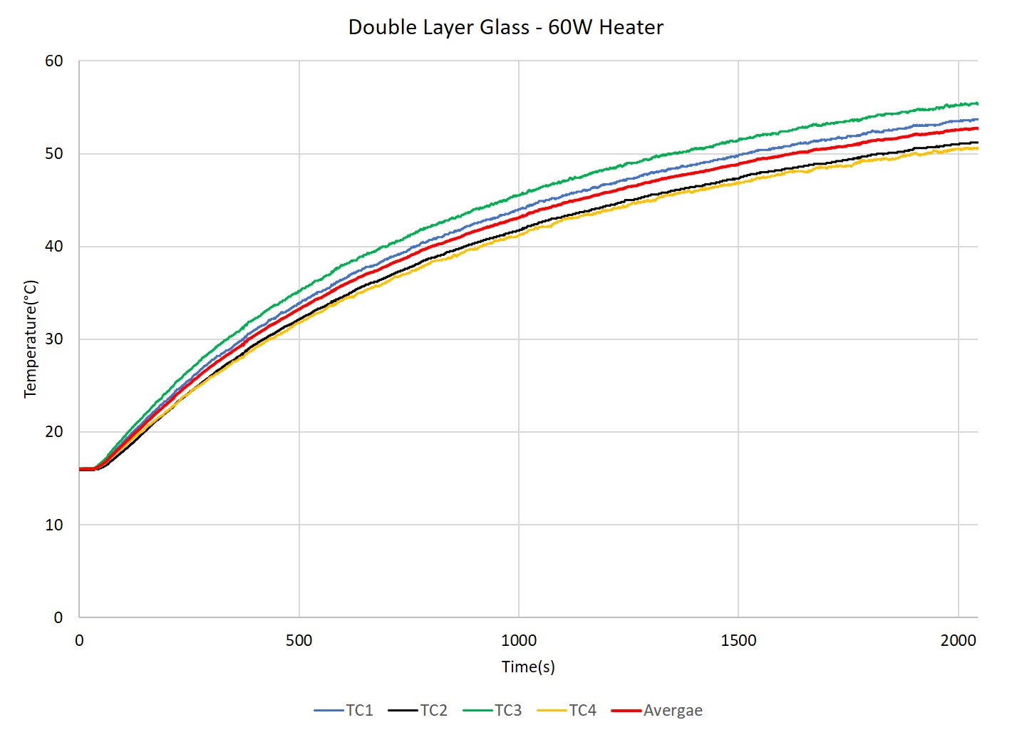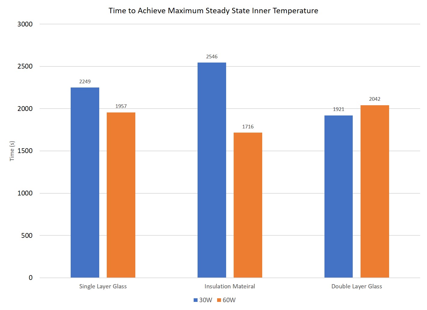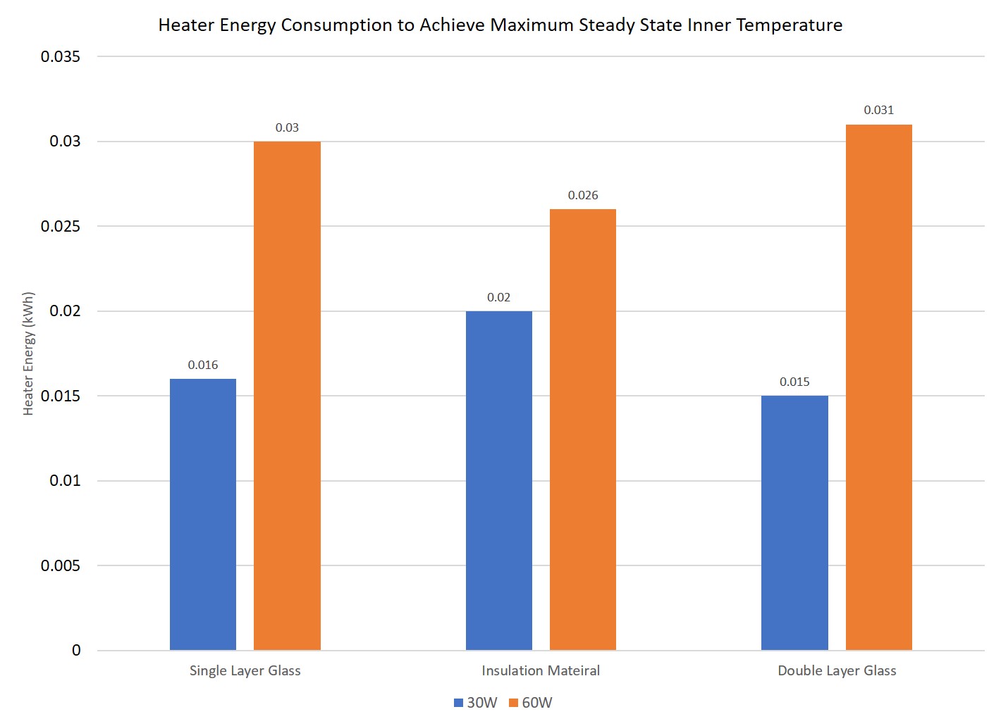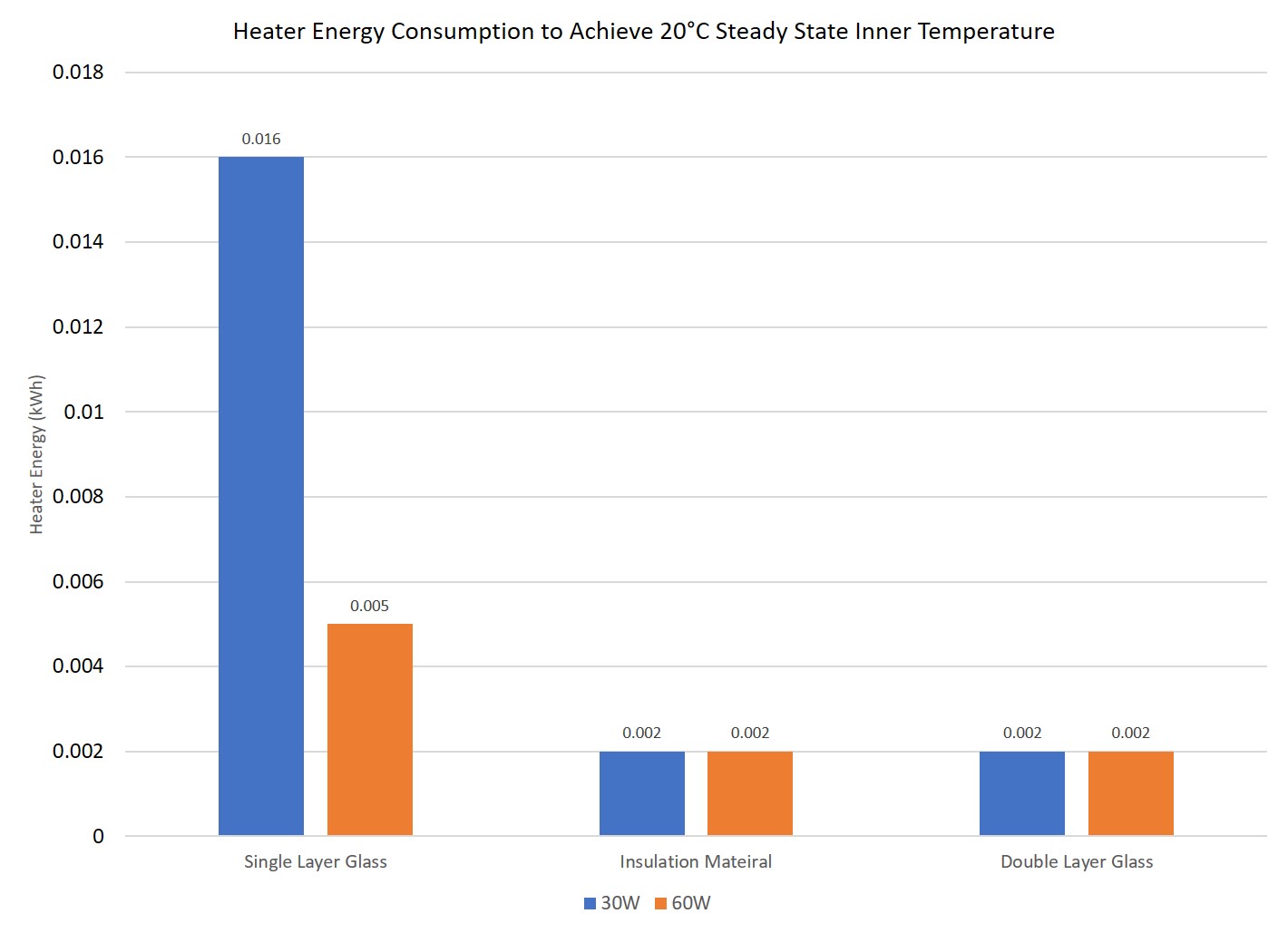 In this study, the steady state temperature and the time required to reach steady state were selected as the primary evaluation indices. The results show that, under the same 30 W heater power, the single layer glass configuration reached a steady state temperature of 19.9 °C, the double layer glass reached 33 °C, and the configuration with thermal insulation achieved 43.6 °C. The corresponding times to reach steady state were 2249 s, 1921 s, and 2546 s, respectively. Although the insulated configuration required a longer time (2546 s) to reach steady state than the other two materials, when both indicators are considered together, the thermal insulation exhibited the best overall performance. This also highlights that both metrics should be jointly assessed, with the steady state temperature being of greater importance. Furthermore, the heater power consumption was also measured. Under the same 30 W heater power, the energy required to reach steady state was 0.016, 0.015, and 0.020 kWh for the single layer glass, double layer glass, and insulation material configurations, respectively. Although the insulated configuration consumed the highest energy (0.020 kWh), it maintained a higher steady state temperature of 43.6 °C compared to the other two configurations, which reasonably explains the higher energy requirement