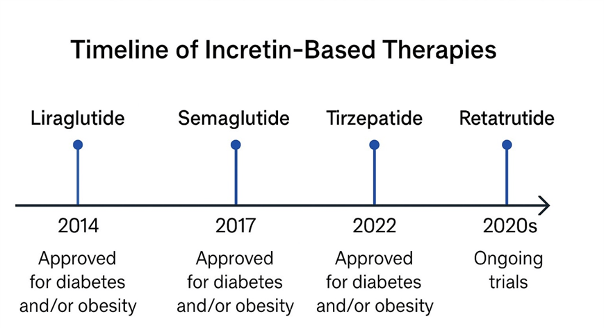 During the previous decade, the enhancement of incretin-based therapy was observed in its effectiveness and clinical use. Early advances in Liraglutide led to more effective drugs such as semaglutide and tirzepatide, the former a dual GLP-1/GIP agonist. Most recently, retatrutid, a triple agonist that works at GLP-1, GIP, and glucagon receptors, is in phase II trials, with an up to 24.2 percent weight loss after 48 weeks. This swift development of the incretin pharmacotherapy is an important innovation cycle in obesity and diabetes treatment18. Figure 2 below depicts the timeline of the development of key GLP-1-based therapeutics with the emphasis on clinical progression of the single and dual/triple receptor agonists.