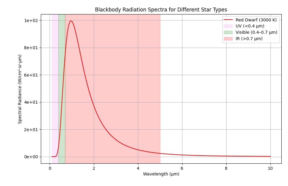To test the hypothesis that alien visions may be incompatible with Earth’s visual light spectrum, we modeled the spectral radiance of three different stellar types using Planck’s Law using python. The Python code calculates and plots blackbody radiation curves for a red dwarf (3000 K), a sun-like star (6000 K), and a blue giant (20000 K).