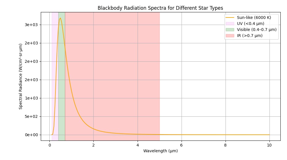We numerically implemented Planck’s Law in Python to compute and visualize the spectral radiance of different stars over the wavelength range of 0.1 µm to 10 µm (UV to near-infrared). Each curve represents the intensity distribution of radiation emitted by a star at a specific temperature. All curve representations assume vacuum and no atmospheric filtering. The full source code and plotting scripts are available in stellar radiation.py.