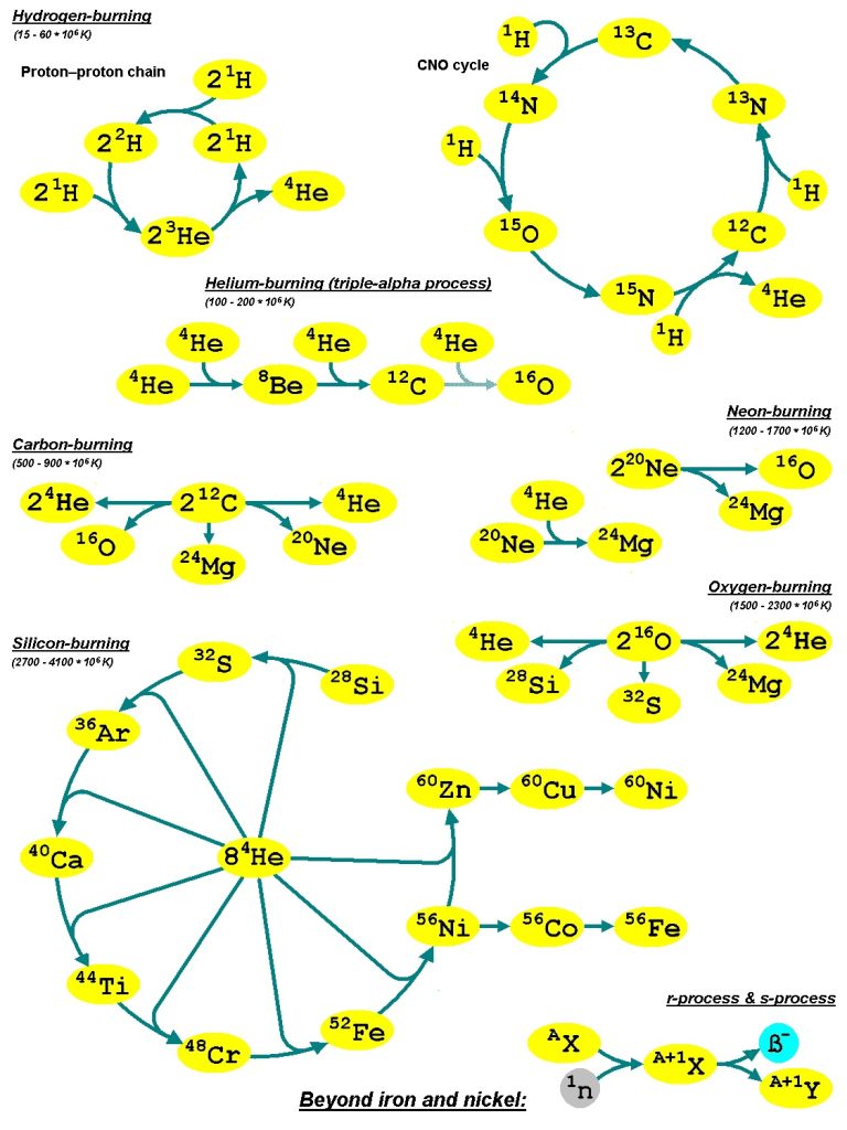 Low temperature stars engage in proton-proton (p-p) chain, as the temperature increases, the fusion shifts to CNO (Carbon – Nitrogen – Oxygen) cycle, then the triple alpha process, followed by carbon and oxygen fusion, and eventually silicon burning.