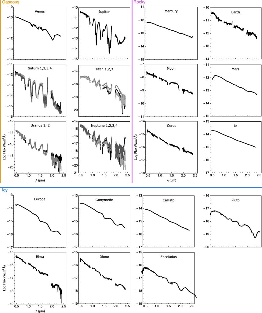 In addition to atmospheric absorption and scattering, the surface composition of planets reflects light in specific ways. For instance, rocks or ice may reflect certain colors, further influencing the dominant light on the planet. Figure 6 shows log monochromatic flux density (energy per unit area, time, and wavelength) versus wavelength for various celestial bodies. It illustrates differences in intensity levels and spectral shapes between gaseous, icy, and rocky objects, highlighting how composition filters and reflects light.1