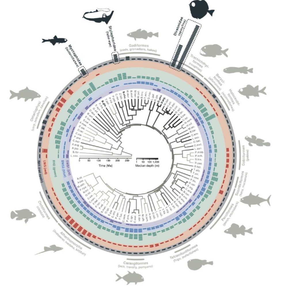 - Musilova, Z., Cortesi, F., Matschiner, M., Davies, W. I. L., Patel, J. S., Stieb, S. M., de Busserolles, F., Malmstrøm, M., Tørresen, O. K., Brown, C. J., Mountford, J. K., Hanel, R., Stenkamp, D. L., Jakobsen, K. S., Carleton, K. L., Jentoft, S., Marshall, N. J., & Salzburger, W. (2019). Vision using multiple distinct rod opsins in deep-sea fishes. Science, 364(6440), 588–592. doi:10.1126/science.aav4632 [↩] [↩] [↩] [↩]