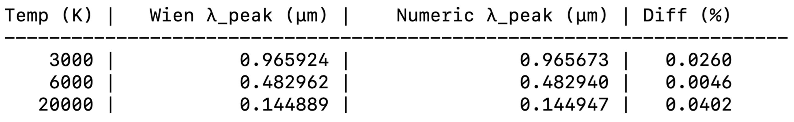 To validate our model, we developed another Python script which calculates and compares Planck’s Law peak spectral radiance with Wien’s Law peak spectral radiance for the different star temperatures to verify that they match. The full source code is available in plancks vs wiens.py. Results show a close match with minimal difference.