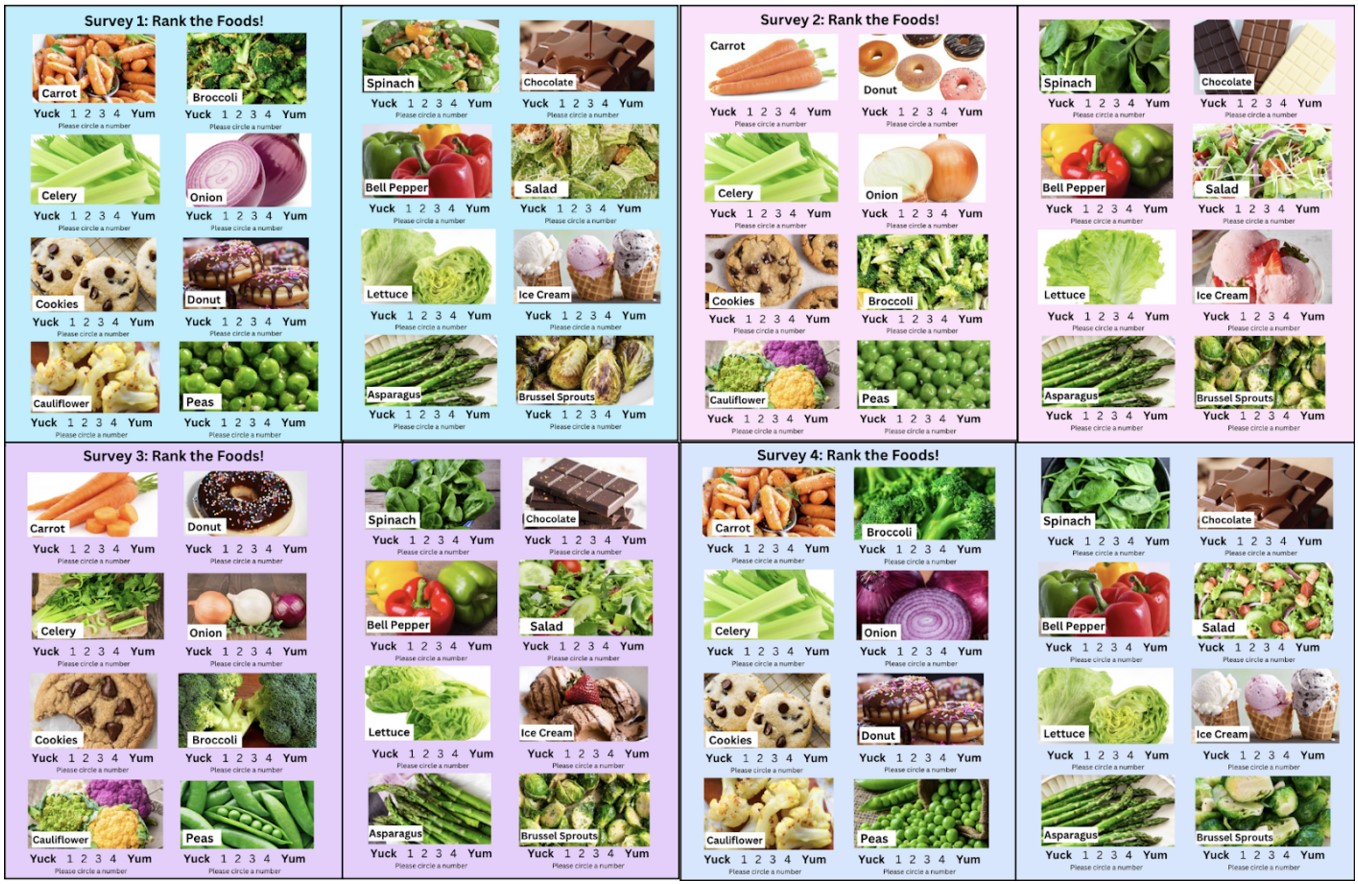 Due to the limitations of time and the drawbacks of an experimental design, the study could contain potential errors. First, if the study lasted for a longer period of time, there might be a more significant increase in ratings of the food items. A longer duration could allow for the collection of more data, reducing the effects of random variation and increasing the findings’ reliability. The original sample size was 88 students. However, due to absences during parts of the study, the complete set of data of some students could not be obtained, which lowered the group sizes to 42 students instead of 44. Although this is a minor difference, a smaller sample size decreases the accuracy of the results, making it harder to generalize the findings to the larger population. Additionally, the experimental and control groups may not have been completely exact, as differences between participants from each group make it difficult to isolate the effect of the variable being tested. The resulting data could be due to inherent differences between the groups and not from the effects of the cartoon images. However, replication of the study could reduce such experimental uncertainties. Participants in the experimental group also may not have interacted with the cards throughout the week; whether it was because they didn’t want to or because they lost them, they would not have been exposed to the effects of the cards. Although participants were asked to rank the foods from the survey in general, the images on the survey contained a mixture of both raw and cooked vegetables, which may have affected the appeal of the food. The images of each week’s survey were also different, which could’ve affected participants’ ratings. Furthermore, due to the Hawthorne effect, participants may have changed their behavior due to awareness of being observed by other students nearby or their teacher30. They might have purposefully rated certain items higher or lower to present a positive image of themselves. Due to these possible limitations, further trials and procedures reducing random errors by keeping conditions stable and consistent can help improve the study’s generalizability and reliability.