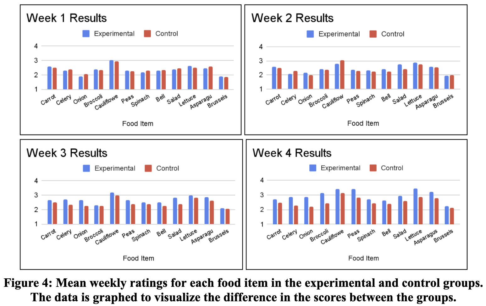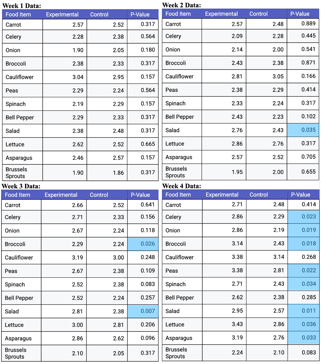 The data were then entered into tables for each week (Figure 2). The first column shows the food items, while the following two columns display the mean ratings of each food for each group. The p-values were determined through statistical significance calculations. Values below 0.05 are statistically significant (highlighted in blue), which means that the difference in ratings between the experimental and control groups is substantial, and a real effect or relationship is being observed rather than random chance. The opposite is true for p-values above 0.05. As seen in the tables, the first two weeks showed few statistically significant differences between the ratings. In contrast, the ratings became more significant by the third and fourth weeks (Figure 2). For example, by week four, eight food items showed significantly higher ratings in the experimental group than in the control group, with a p-value less than 0.05.