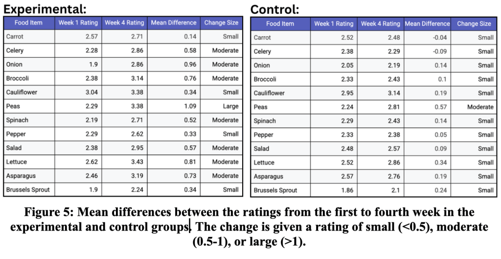 The data was then entered into an SPSS 29.0 program to calculate its significance. Above is an example calculation using the data for the broccoli food item (Figure 3). Lastly, the data was charted to visualize the differences between each group’s scores. In weeks one and two, the scores remained relatively similar, with some differences occurring due to chance, as they have an insignificant statistical difference (Figure 4). By the third and fourth weeks, there were more drastic differences between the ratings of the control and experimental groups, with the experimental ratings becoming much higher than the control ratings, showing that students exposed to the cartoons began developing significantly more positive attitudes towards the foods that were being promoted. For example, the mean Broccoli ratings increased from 2.38 to 3.14 in the experimental group, while the mean ratings in the control group only increased from 2.33 to 2.43. By comparing the mean ratings from the first week to the last, the ratings in the experimental group were larger than the control group, with most of the changes being moderate, while most of the changes in the control were small (Figure 5). Most foods showed an increased rating over the study, while some foods like Brussels sprouts, carrots, and cauliflower remained relatively high or low throughout all four weeks. It’s possible that participants were familiar with these foods and may have already developed an enduring attitude towards them that is hard to alter. In addition, parental eating habits and school lunch programs could also influence the results and how familiar the students were with the foods.