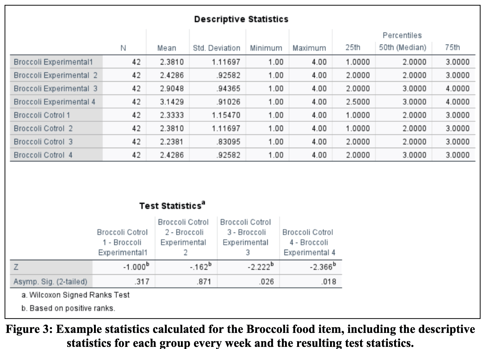 After data was collected from the surveys from all four weeks, the mean rating for each healthy food item was calculated every week by averaging all the scores in each group. To determine if there was a significant change in food ratings over the study between the two groups, statistical significance calculations were performed using the Wilcoxon Signed-Rank Test. The Wilcoxon Signed-Rank Test is a non-parametric statistical test used to compare two related samples or repeated measurements of the same group23. It is often used to determine if there is a significant difference between two sets of data that are paired or related to each other. It is also used to examine the effect of a treatment introduced during a study to evaluate changes in participants’ behaviors. This study compares the ratings between the experimental group and the control group to examine whether or not the cards have a substantial effect on the ratings of the foods.