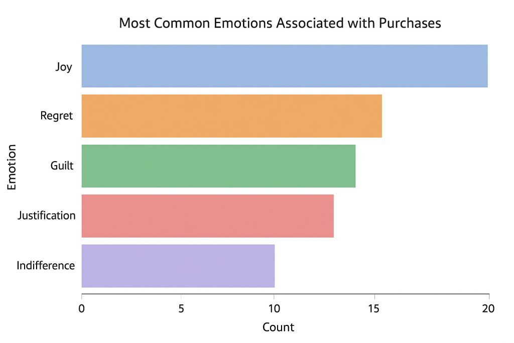 Emotions matter after spending, too. Guilt is a classic post-purchase emotion, especially among young spenders.7 highlight how guilt and regret surface most often when purchases clash with one’s values. This study supports that: 62% of respondents felt guilt after non-essential buys, and guilt was more common after altruistic acts were used as a “license.”