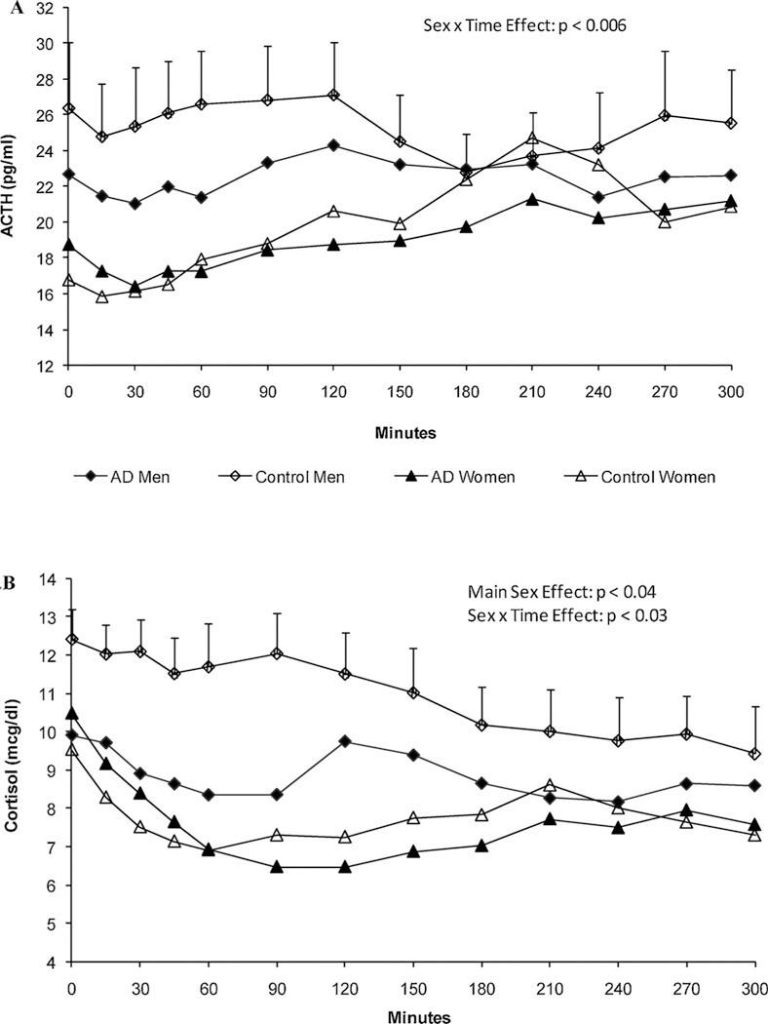 - Anthenelli, R. M., Heffner, J. L., Blom, T. J., Daniel, B. E., McKenna, B. S., & Wand, G. S. (2018). Sex differences in the ACTH and cortisol response to pharmacological probes are stressor-specific and occur regardless of alcohol dependence history. Psychoneuroendocrinology 94, 72-82. [↩] [↩] [↩] [↩]