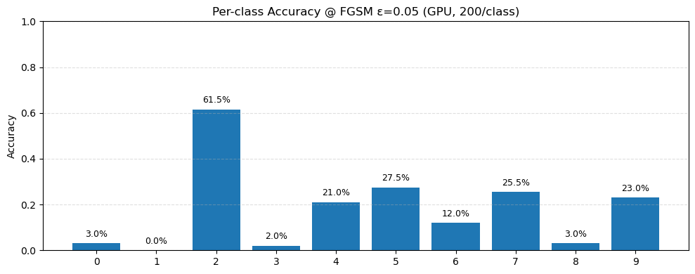 , the model had an adversarial accuracy of 17.85%. The per-class accuracy can be seen in figure 10 below.