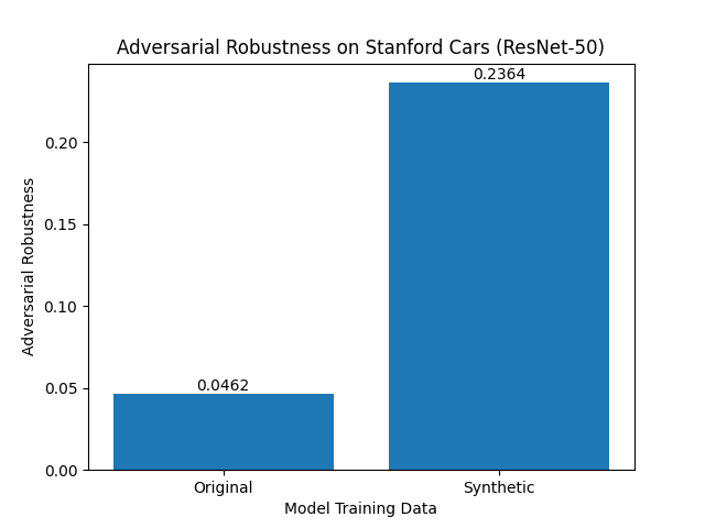 Gowal et al. (2021)4 propose that the addition of synthetically generated low-quality data to the training set can improve adversarial robustness. This experiment aims to justify these findings. We propose an experiment involving two models of the same architecture; however, one is trained on real data (Stanford Cars and MNIST) while the other model was trained on the synthetically generated datasets (we term them SynMNIST and SynCars).