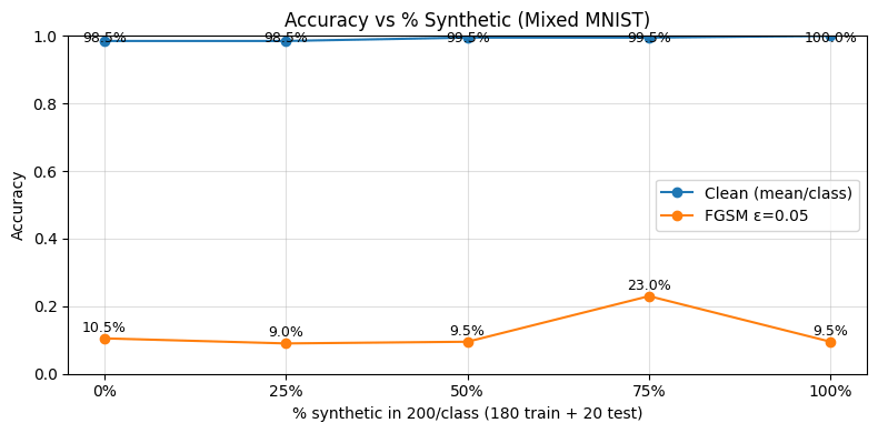 To further generalize the claim, we experimented with adding a proportion of synthetic data to the real training set. Specifically, we experimented with adding 25%, 50% and 75% of synthetic data to train a classifier on the MNIST dataset and evaluate performance on adversarial examples.