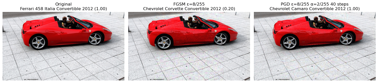 Figure 4 below shows how FGSM perturbations vary from PGD for the same original image and also the predictions from a pretrained car make and model classifier. the predictions from a pretrained car make and model classifier.