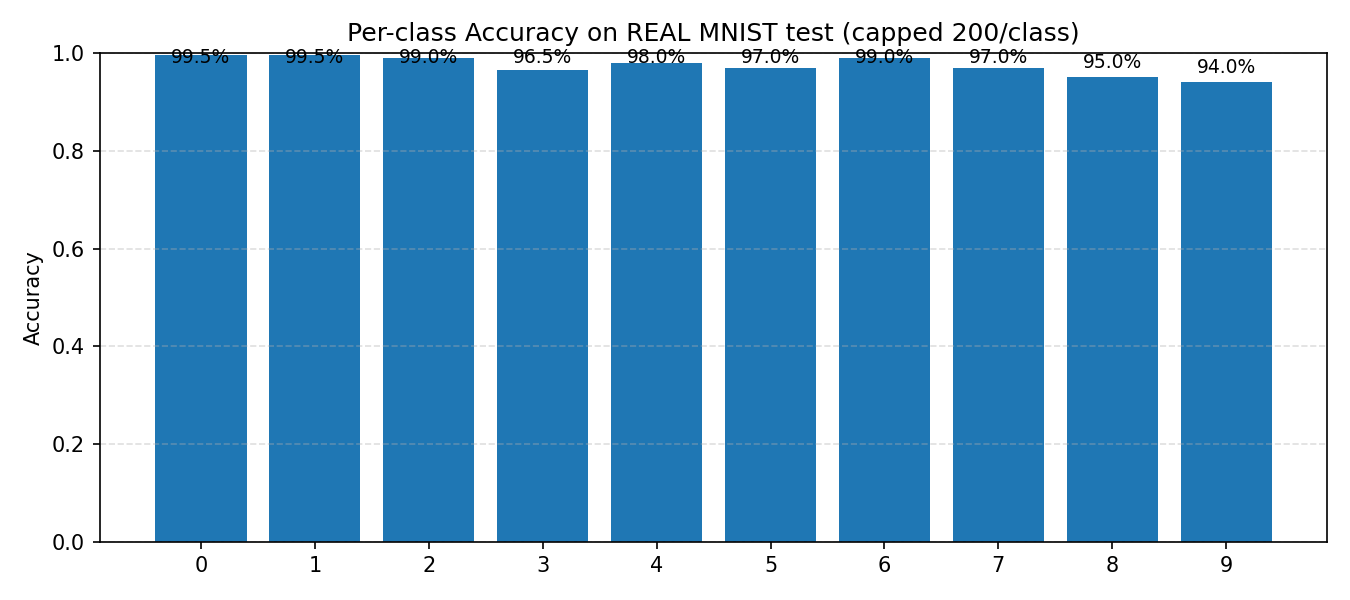 Similarly, the model trained on real data scored 98.65% for baseline accuracy tested on real MNIST images. When tested on adversarial examples created using FGSM with
