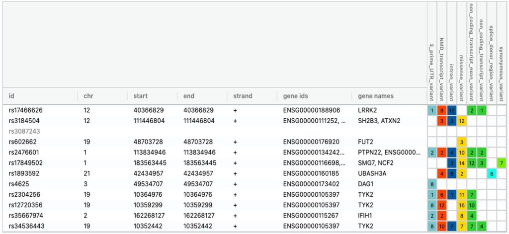 Chromosomal genomic location and annotation were also extracted for each clinically significant common risk alleles.. The gene names, genomic coordinates along with annotations for each of these genetic risk variants in all 4 diseases are shown in Figure 5. Further, VaradB analysis was used to validate these common clinically significant risk variants. VARAdb is a useful resource for selecting potential functional variations and interpreting their effects on human diseases and biological processes.