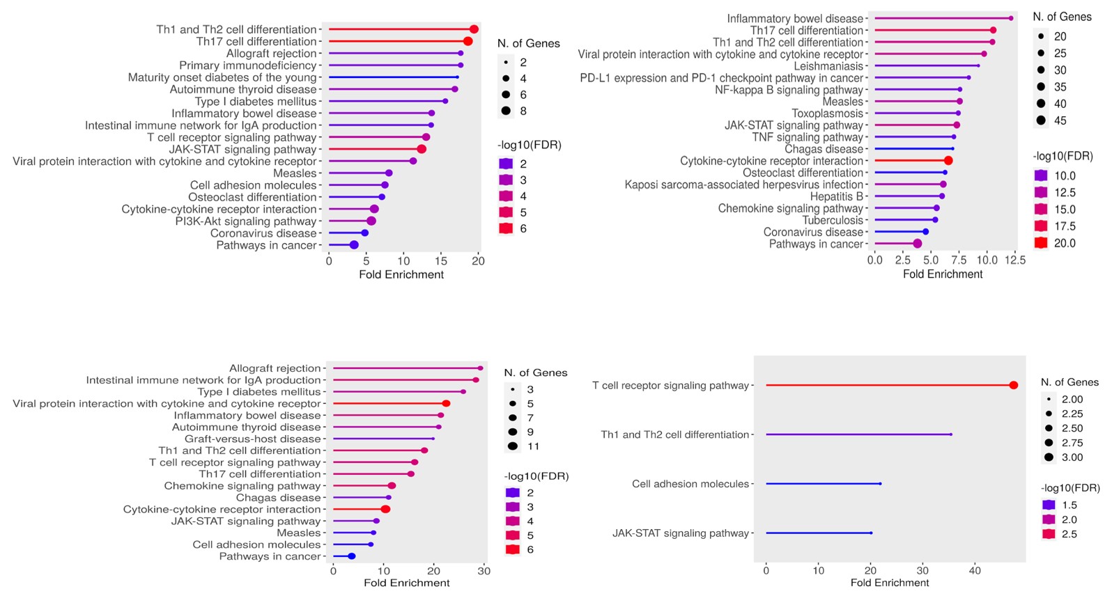 Pathway enrichment analysis for risk allele associated genes for each of the 4 autoimmune diseases revealed several commonly affected pathways. These shared pathways include allograft rejection, T cell differentiation and the JAK-STAT pathway indicating a convergence of immune-related molecular mechanisms across diseases. Corresponding KEGG pathway analysis are shown for T1D (Figure 4A), Rheumatoid (Figure 4B), Celiac (Figure 4C) and Hashimoto’s (Figure 4D). The size of the dots represents the number of genes, and the color represents the significance of the FDR value. FDR is False discovery rate and the higher the value of -log(FDR), smaller is FDR.
