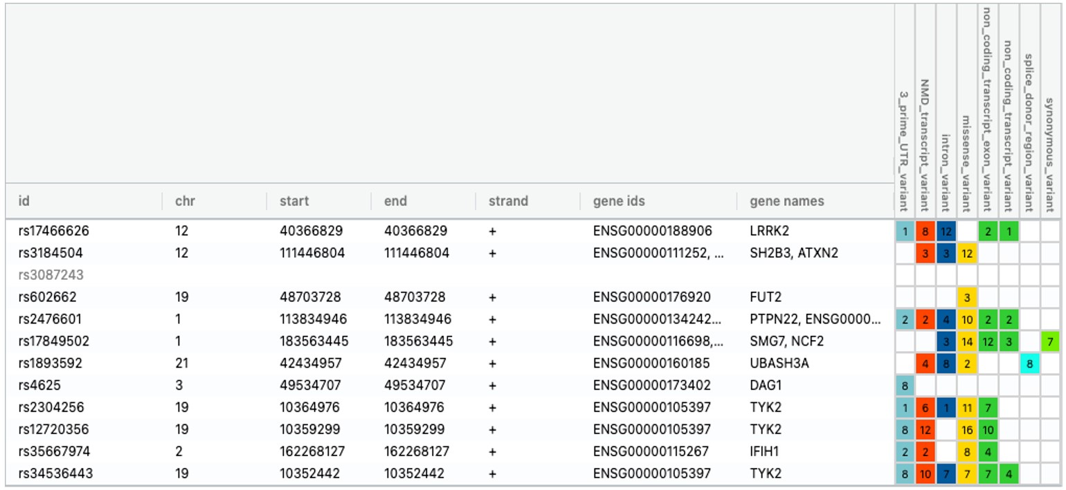 To prioritize clinically relevant risk variants, a filtering pipeline using dbSNP and varadB was implemented. This yielded variants in coding regions for genes such as PTPN22, FUT2, TYK2 and NCF2 as well as non-coding variants in regulatory regions of CTLA4, SH2B3, and LRRK2. TYK2 ILE684 to SER684 mutation was identified as common among all 4 diseases and can be a potential target for drug discovery. Structural modeling suggested this mutation does not alter protein structure significantly but likely impairs TYK2 function, consistent with its previously reported catalytic inactivity.