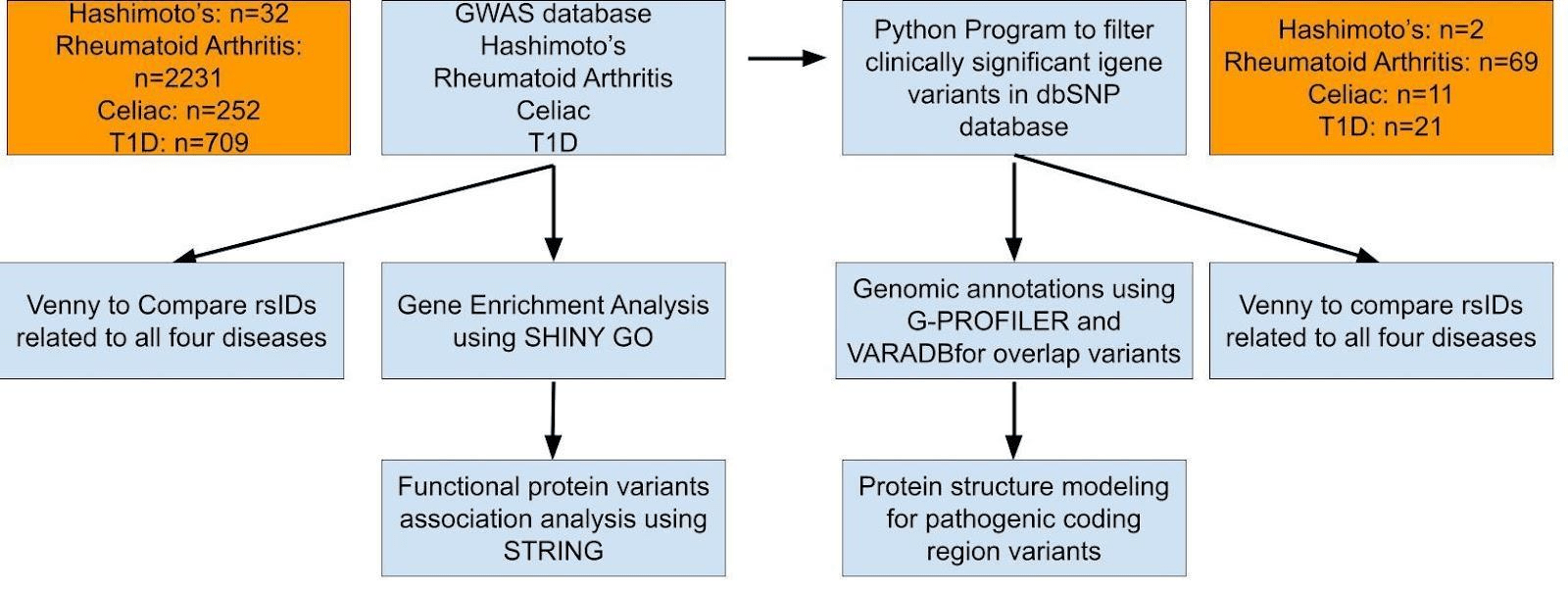 GWAS8 genomic variants datasets for (T1D, RA, Hashimoto’s disease, Celiac disease) were downloaded. Overlap analysis between rsIDs and genes was performed to identify common genetic variants and affected genes amongst all 4 diseases using Venny software tool9. The rsID number is a unique label (“rs” followed by a number) are used by researchers and databases to identify a specific SNP (Single Nucleotide Polymorphism). Gene enrichment analysis was performed for SNPs using Shiny Go10 to identify pathway enrichment for each of the disease. Overlap genes were further analyzed for protein-protein interactions using String database analysis11. String database contains information about protein-protein interactions reported through co-occurence of genes, co-expressions or experimental data. Python programming using Jupyter notebook was used to shortlist clinically relevant variants from a huge dbSNP database12 of 1.5 million variants. rsIDs were input into this script and clinically relevant SNPs were derived with genomic location as output. VaradB13 and G-profiler14 analysis was performed to further annotate non-coding and coding variants common amongst all 4 diseases. Structure modeling for WT and mutant TYK2 was performed using SWISS Model and superimposed using Pymol15.