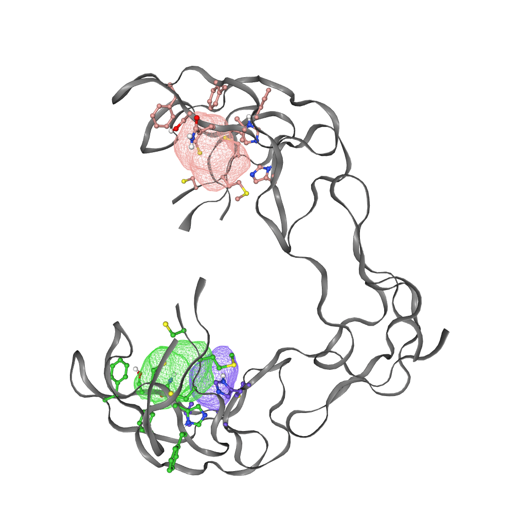 FTSite identified 3 potential binding sites for the GITR protein using the energetic-based method. Pictures of binding sites identified on the GITR protein by FTSite are shown (Fig. 4).