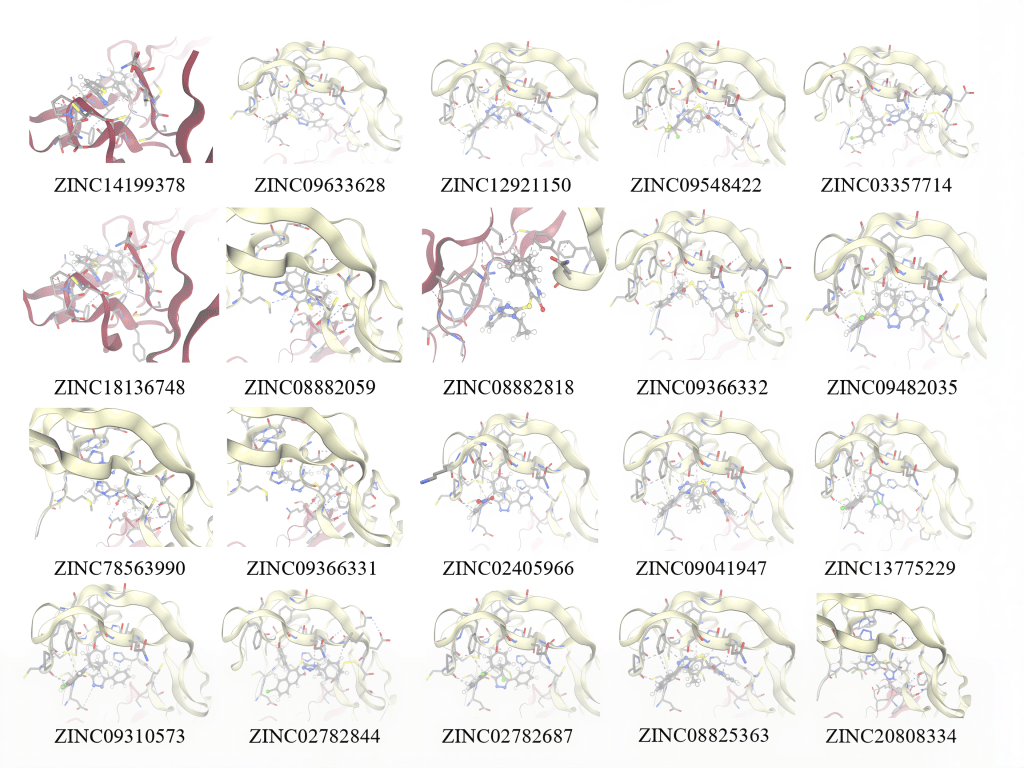 Figure 12. The most favorable clusters for docking simulations between small molecules (balls and sticks) and GITR (sticks and ribbons) are displayed by Swissdock.