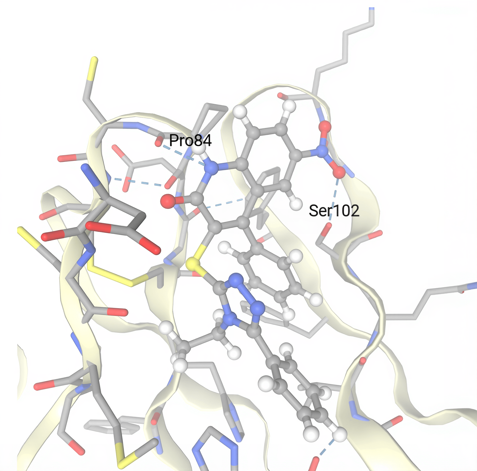 Figure 13. The most favorable cluster for docking interactions between ZINC09041947 (balls and sticks) and GITR (sticks and ribbons) is displayed by Swissdock, with key amino acid residues labeled.