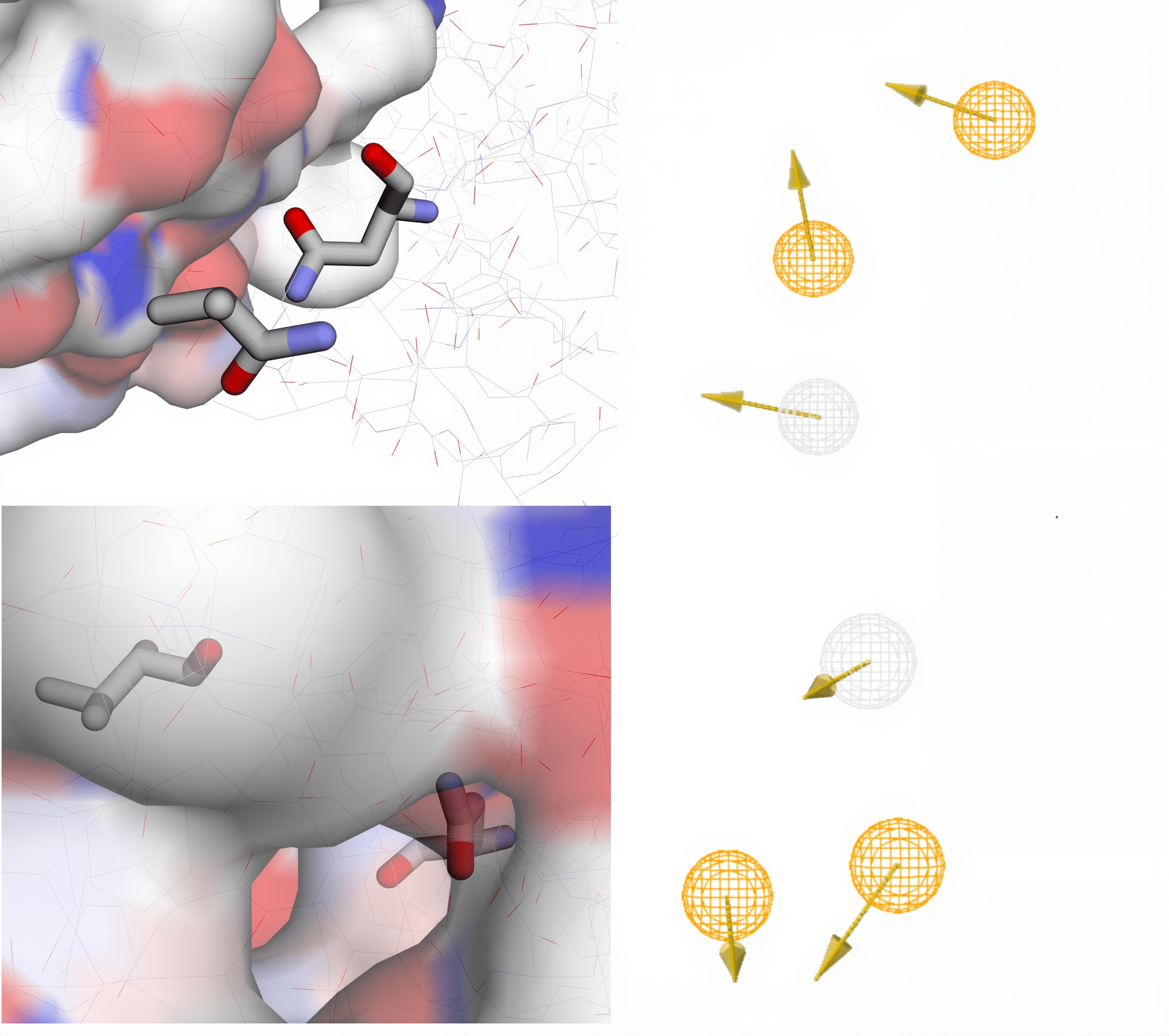 Figure 7. The first (top left) and second (bottom left) model clusters are displayed as 3D structures by PocketQuery, and their pharmacophore maps are found in the top right and bottom right illustrations, respectively.