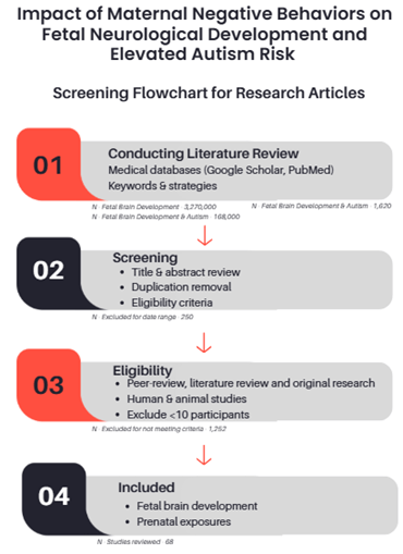 A comprehensive literature review was conducted, primarily utilizing medical article databases such as Google Scholar and PubMed. The keyword development followed a three-step approach: step one focused on fetal brain development; step two incorporated negative social behaviors during pregnancy; and step three combined both sets to identify studies linking prenatal exposures to neurological development outcomes. Using the Boolean operators, combinations included: step one – “fetal brain development”, step two – AND (“autism” OR “ASD”), step three AND (“smoking” OR “alcohol” OR “recreational drugs”). Additionally, epidemiological and prevalence studies on autism were reviewed to support the exposure-related findings. Documented each search for reproducibility and recorded all search combinations and strategies. Articles were limited to a date range of 2005 through 2025, as a mechanism to provide more appropriate and recent evidence-based reviews. Article research was conducted between August 2024 and March 2025.