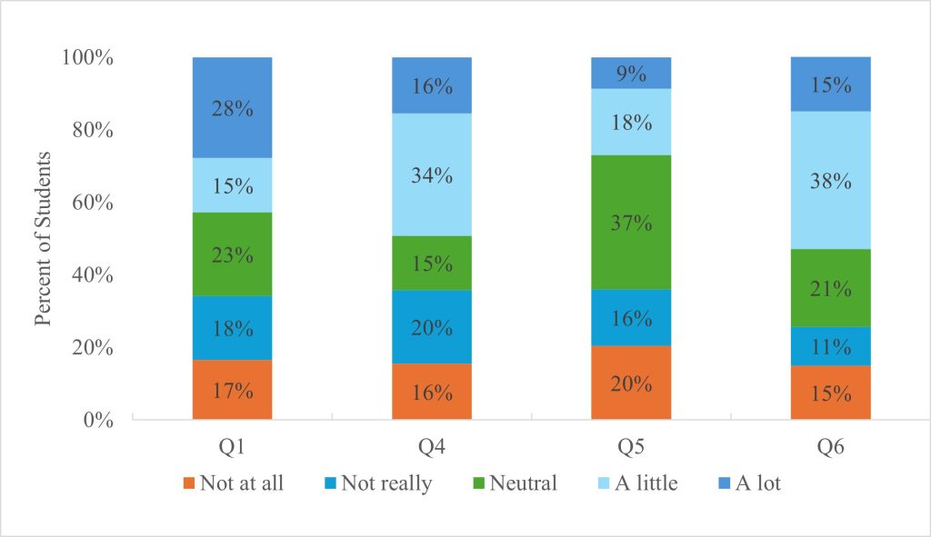 Q6.[Dishonesty] Will AI use lead to more students engaging in academic dishonesty? (Not at all, Not really, Neutral, Somewhat, A lot)