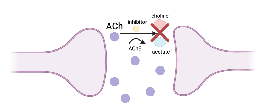 The cholinesterase inhibitor blocks the enzyme acetylcholinesterase (AChE), which inhibits the breakdown of ACh, a neurotransmitter associated with learning and memory, into choline and acetate. This raises levels of ACh in AD patients, allowing for improved learning, memory, and overall cognitive funciton34.