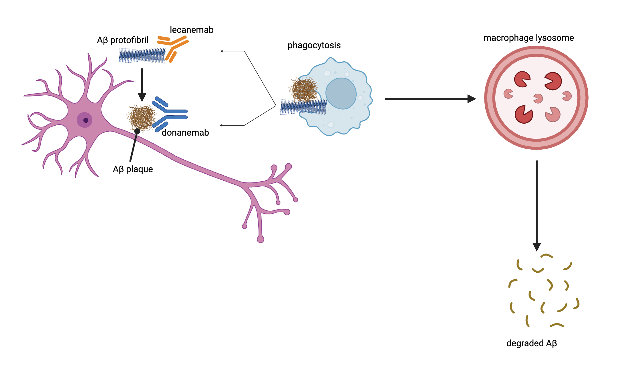Aβ targeting antibodies, such as donanemab and lecanemab, lead to the degradation of Aβ. Lecanemab binds to the soluble Aβ protofibril before it constitutes Aβ plaque. Donanemab binds to the Aβ plaque itself. Macrophages recognize these antibodies and engulf the Aβ protofibril or the Aβ plaque. It is then degraded in the lysosome of the macrophage, helping clear Aβ build up48,49.
