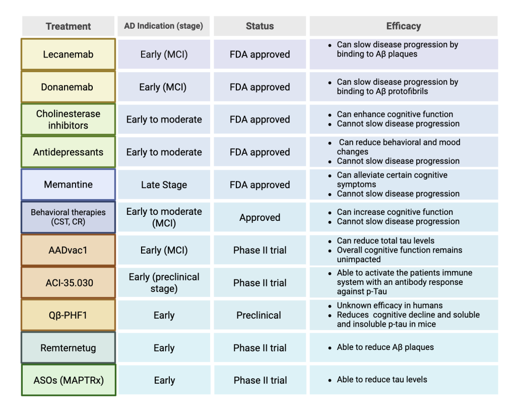 The development of various Aβ-targeting antibodies has helped to treat AD in its early stages41. In recent years, two of these antibodies, lecanemab and donanemab have been approved by the FDA for early-stage AD patients. Lecanemab is a humanized monoclonal IgG1 antibody medication that binds to soluble aggregated Aβ protofibrils rather than plaques (Figure 2). In an 18-month, multicenter, double-blind, phase 3 trial involving individuals 50 to 90 years of age with early AD, persons that received intravenous injections of lecanemab showed a significant reduction in cognitive decline compared to placebo treated control patients, indicating slowed disease progression. However, lecanemab is associated with adverse effects like infusion-related reactions and amyloid-related imaging abnormalities (ARIA) with edema or effusions42. with higher rates of these side effects occurring in individuals with the APOE4 allele43. After 18 months of administration of lecanemab, ARIA occurrences decrease along with dosage in non carriers of APOE444. Additionally, lecanemab may have reduced efficacy in women45. Early-stage AD patients are also treated with donanemab, a humanized monoclonal IgG1 antibody that binds to a modified form of Aβ protein, N3pE-Aβ, found in Aβ plaques (Figure 2). In a randomized clinical trial that included 1736 participants with early symptomatic Alzheimer disease and amyloid and tau, individuals that were administered donanemab showed significantly slowed disease progression and improved cognition compared to placebo groups. Groups treated with donanemab had a -6.02 change in score in the integrated Alzheimer Disease Rating Scale, while placebo groups had a change of -9.27, with lower scores indicating worse cognitive function46. Long term administration was associated with ARIA, with higher rates in individuals with the APOE4 allele47. Although lecanemab and donanemab have demonstrated efficacy clinically, it is important to note that Aβ antibody treatments are considered to be expensive medications and therefore may not be an accessible or affordable treatment option for all early-stage AD patients.