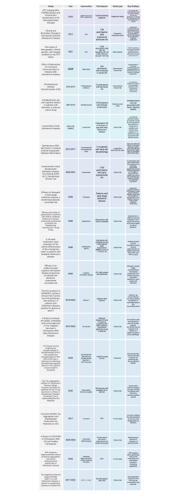 This table shows various AD interventions, which stage of AD they are used for, their status in the drug approval process and their overall efficacy.