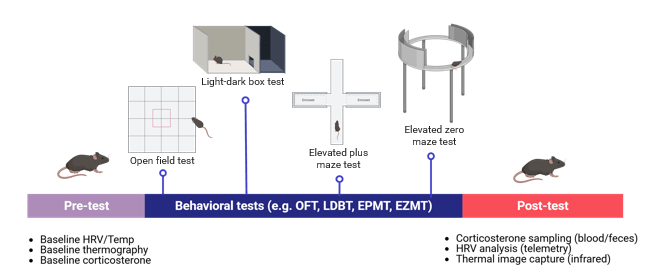In a typical experimental timeline (illustrated schematically in Figure 2), baseline physiological parameters such as heart rate, core temperature, or corticosterone levels can be recorded before exposure to the behavioral assay. During the testing phase—for example, the elevated plus maze or open field—video-tracking software captures locomotor trajectories and postural dynamics, while telemetry or infrared thermography continuously monitors autonomic and thermal responses7‘27. Post-test sampling (e.g., plasma or fecal corticosterone assays) provides delayed physiological readouts of stress reactivity.