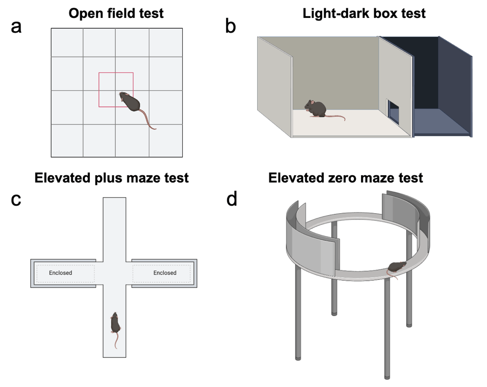 In rodents, anxiety-like behavior has been conceptualized as a generalized psychological and physiological response to uncertain or threatening stimuli5. Experimental paradigms to study such responses are typically divided into two categories: conditioned and unconditioned tests6. Conditioned tests require learning of an association between a neutral stimulus and an aversive event, such as a fear conditioning test, thus depending on intact memory and sensory processing6. In contrast, unconditioned tests exploit spontaneous, evolutionarily conserved behaviors, such as the tendency to avoid open, illuminated areas6. These tests, including the open field test (OFT), elevated plus maze test (EPMT), and light-dark box test (LDBT), are favored for their simplicity and strong ethological relevance, although they are also criticized regarding interpretability and external validity6.