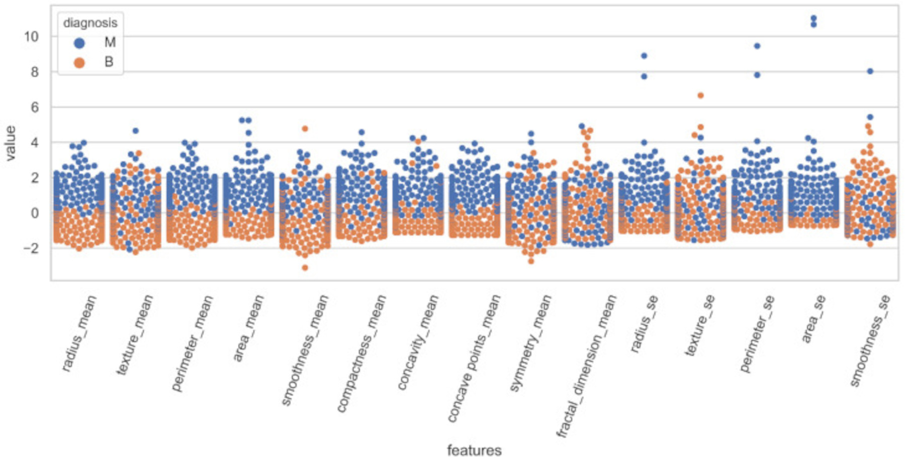 The dataset used in this research is the Wisconsin Breast Cancer Dataset (WBCD) of FNA data, obtained from the UC Irvine Machine Learning Repository17. The dataset consists of 30 distinct features. Each of the 569 data samples is labeled as benign (B) or malignant (M), with the dataset having 357 benign and 212 malignant tumor samples in total: 62.74% benign, and 37.26% malignant. A representation of the dataset, directly sourced from the work of Shafique et al.7, is shown in Figure 2.