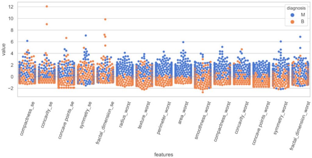 For each cell nucleus, ten real-valued features are computed: radius, texture, perimeter, area, smoothness, compactness, concavity, concave points, symmetry, and fractal dimension. For each of the 10 features, the mean, standard error, and worst (the mean of the three largest values) of these features are computed for each cell nucleus, resulting in a total of 30 features.
