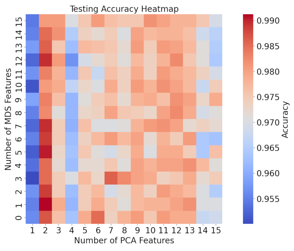 The accuracy values for NMDS only, (when the number of PCA features is 0) are not shown in the plot, due to their consistently low values of 63 to 65% that cause interpretation of the rest of the heatmap to become very difficult if included. These values will be explained later on. As seen in Figure 4, a combination of 2 PCA features with any number of NMDS features resulted in the highest testing accuracies, with some over 99%, exceeding the baseline accuracy of 98.1% by around 1%. The accuracy values stayed relatively constant as the number of NMDS features changed, and increased around the range of 9-12 PCA features.