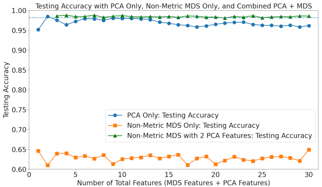 Since NMDS with 2 PCA features was shown to result in high accuracy, the number of 2 PCA features was chosen to be combined with an increasing number of non-metric features. The individual capabilities of PCA and NMDS were also evaluated. The results are shown in Figure 5.