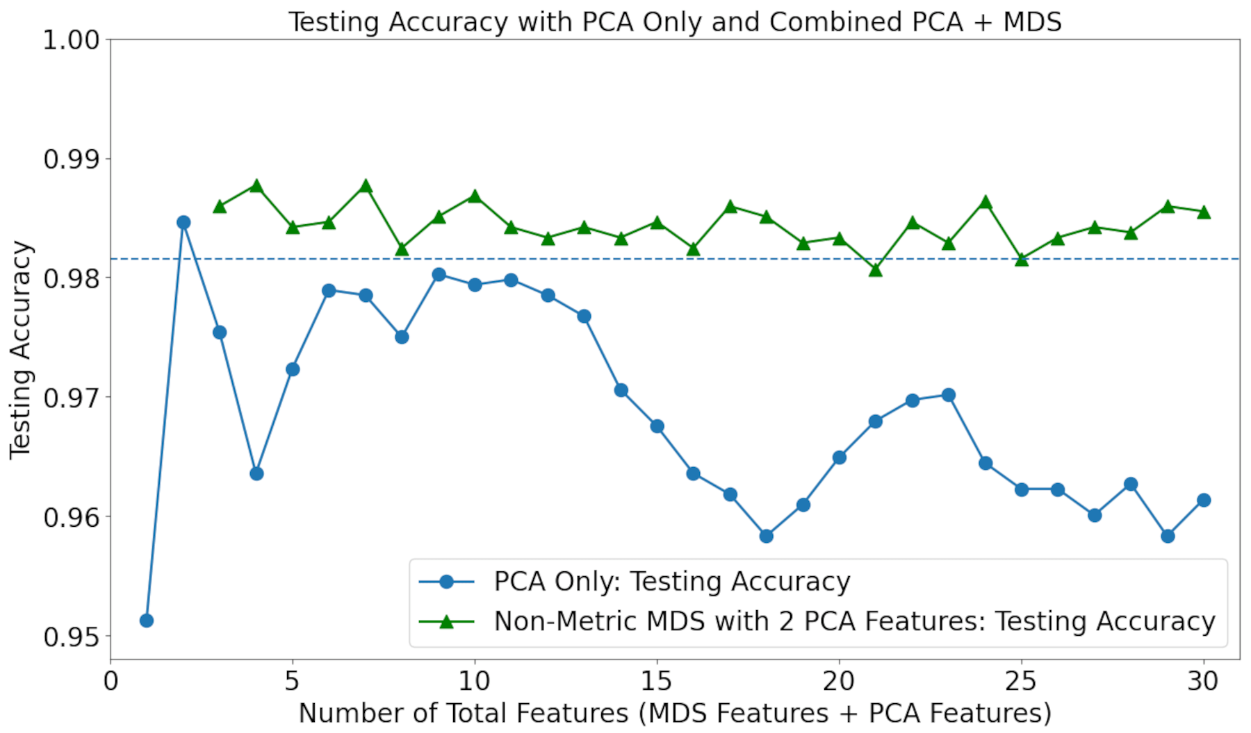 Since the highest testing accuracy values were present when the number of PCA features was 2, the number of 2 PCA features was chosen to be combined with an increasing number of NMDS features, in order to evaluate the true degree to which the combination of PCA and NMDS improved the reference testing accuracy, from 1 to 28, to perform further testing.