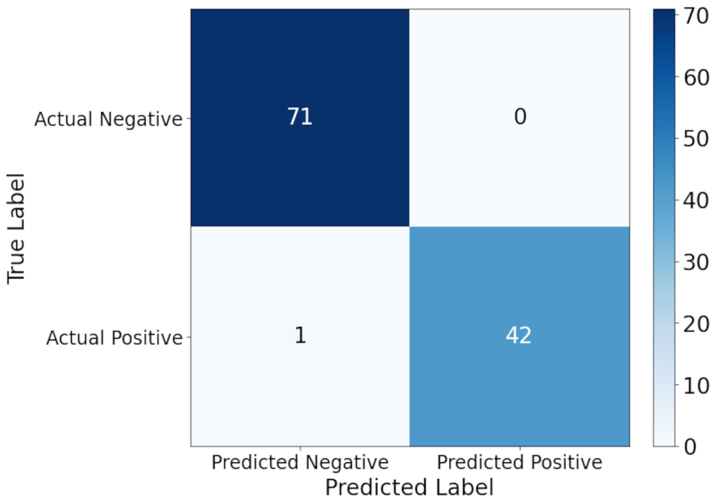 In Figure 6 below, a confusion matrix for the actual and predicted negatives and positives is shown for the specific model with a feature combination of 1 NMDS feature and 2 PCA features. This combination is shown because it consistently showed one of the highest accuracies in Figures 4 and 5, but also produced P-values very close to the significance values in the statistical testing. In addition, with only 3 total features for prediction, it is an example of the power of LINDA to provide excellent results with only 10% of the original number of features. Despite only having 3 input features to use for classification, the model correctly diagnosed all benign cancers, and correctly diagnosed all but one malignant cancers.