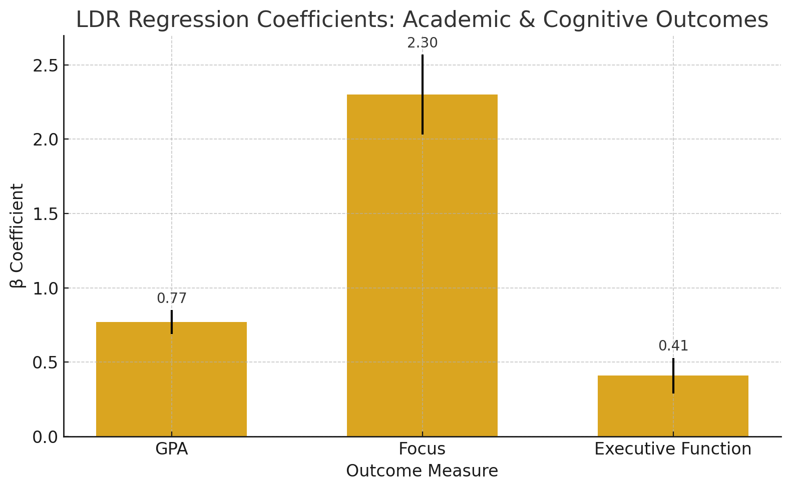 Table 1 shows preliminary comparisons suggesting that students who participated in LDR reported higher mean values across all outcome variables: academic, cognitive, and mental outcomes. Statistical analysis confirmed that LDR students demonstrate significantly higher cognitive function and mental well-being as seen in Table 2.