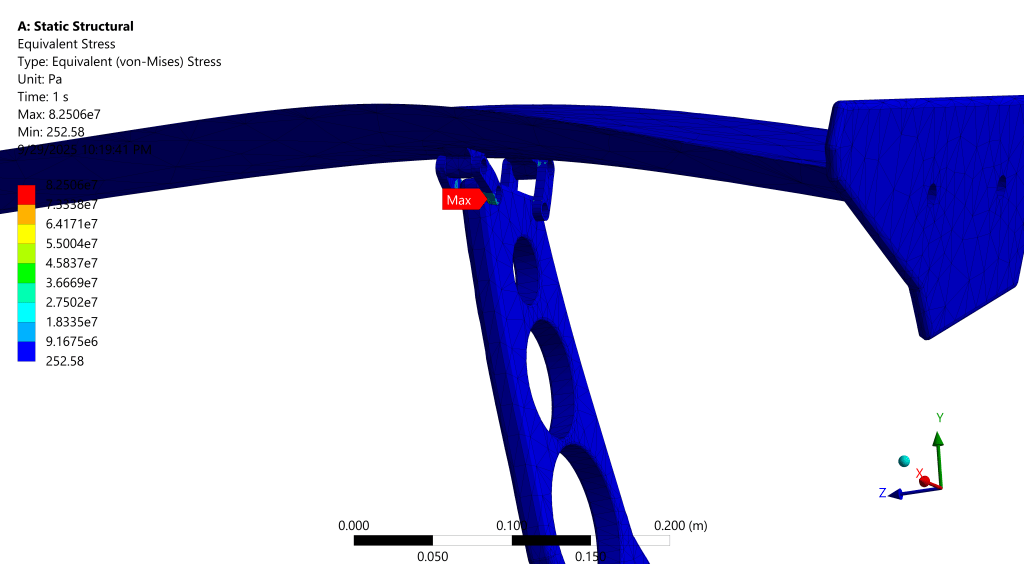 For ABS, the aerodynamic loading on the spoiler induces global bending, placing the lower surface in tension and the upper surface in compression. While shear stresses are present near the supports, the critical stresses arise in the tensile region of the cross-section. Since ABS generally exhibits lower tensile strength compared to compressive strength, the safety factor was evaluated with respect to the tensile/flexural limit, which represents the governing failure mode26,27.