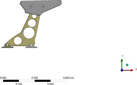 To justify the working mesh of ∼29,000 elements, we performed an refinement check using three meshes (coarse ∼15k, medium ∼29k, fine ∼60k). Boundary conditions and loads were identical across meshes, with local refinement around fillets and mounting features. The governing response quantities were (i) maximum tip displacement and (ii) peak von Mises stress at the hotspot. Between the medium and fine meshes, the change in tip displacement was below a 2% tolerance and the change in peak stress was within a 5% tolerance, while the location of the stress hotspot remained unchanged. Accordingly, the ∼29k-element mesh was selected as the coarsest mesh that satisfies these convergence criteria, providing mesh- independent results. For modal analysis, the first natural frequency varied negligibly between the medium and fine meshes (within 2%), supporting the same mesh choice.